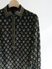 コンパクトなサイジングが特徴のシルクブラウス。肌触りはシルク100%の滑らかな質感で、ブラックをベースにグリーンとオレンジカラーの映える甘くなりすぎないデザインが魅力の一枚。
